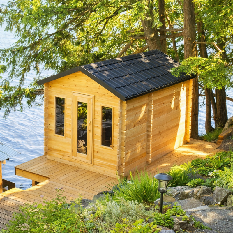 The Georgian Cabin Sauna with Changeroom, part of the Canadian Timber Collection, is handcrafted by Leisurecraft from Eastern White Cedar that is lighter in colour and has tight knots in the wood. The cabin shape fits in well with all cottages and homes and comes in kit form. The metal shingle roof ensures that your sauna is dry and ready to enjoy.